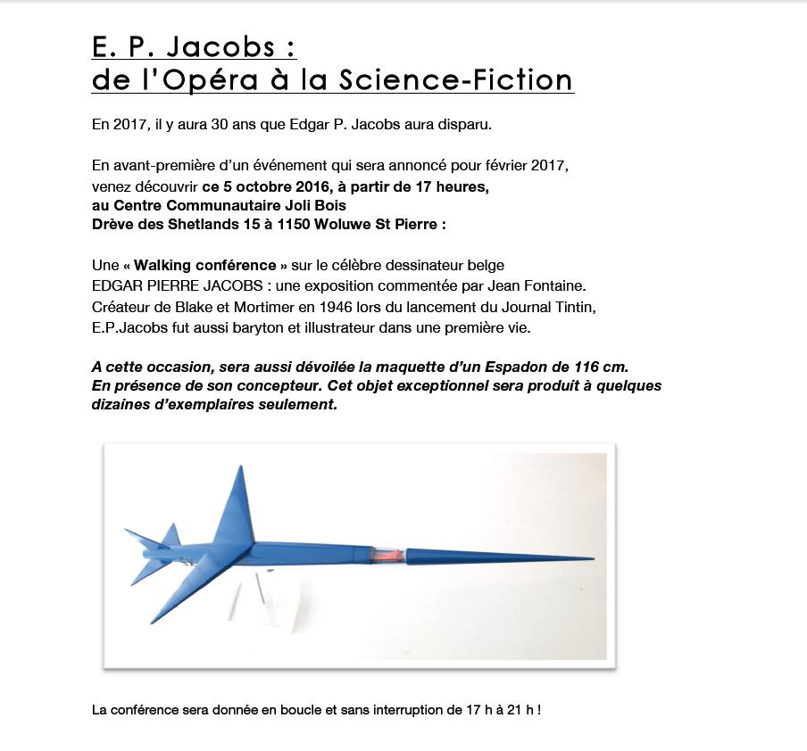 Au travers de documents rares et parfois surprenants, un rideau rouge se lèvera sur la face cachée de Jacobs, et vous découvrirez ses cahiers d’écoliers et ses travaux d’illustrateur, ses épouses, amis et rivaux, sa carrière de baryton, ses années de vaches maigres, sa collaboration à l’hebdomadaire Bravo et au lancement du journal Tintin, et quelques révélations inédites…