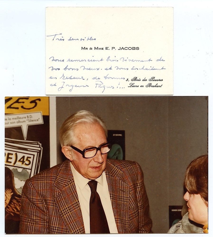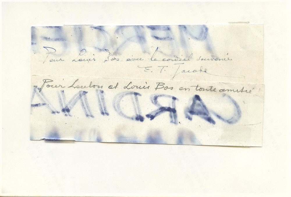 "Carte de visite manuscrite de l'artiste et de son épouse afin de souhaiter de "Joyeuses Pâques" (traces de papier collant au verso). La carte est accompagnée de son enveloppe manuscrite. On y joint une photo de l'artiste. Une dédicace manuscrite (avec signature de l'artiste) est collée au verso de celle-ci".