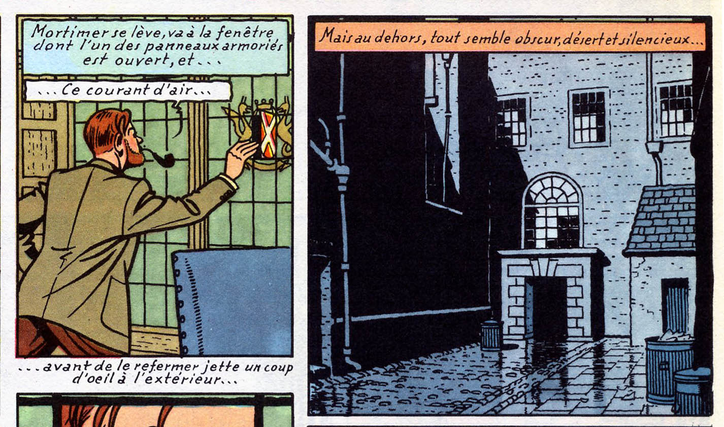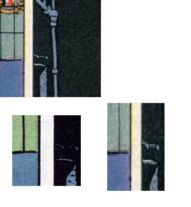Ce petit jeu est très intéressant, on finit par voir certaines vignettes sous un autre angle. Celle de droite est vraiment magnifique, d'autant qu'elle est admirablement bien mise en valeur par la rupture de plan et de couleur. Et le reflet est d'un réalisme époustouflant, on retrouve beaucoup ça dans SOS Météores (le summum de l'art graphique de Jacobs selon moi).