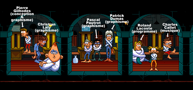 Un écran du jeu immortalisait d'ailleurs les principaux intervenants, graphistes, programmeur et musicien. Une joyeuse bande !