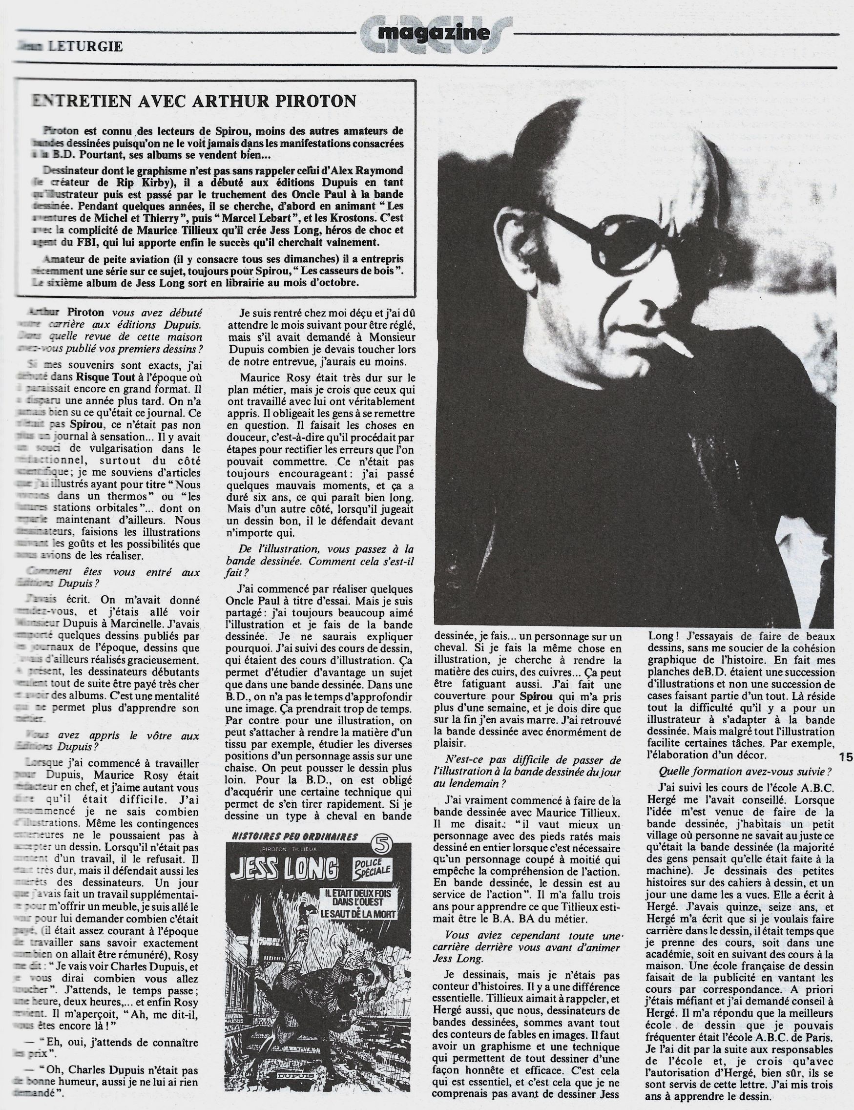 On dispose de peu d'écrits journalistiques sur Arthur Piroton; on appréciera donc d'autant plus cet entretien qu'il avait accordé au magazine "Circus" en 1980 (n°30).