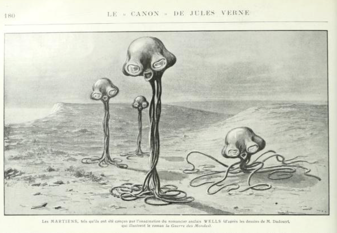Je cherchais également mais je ne trouvais pas . Grand merci pour le lien qui m'a permis de mieux lire la légende: "Les MARTIENS , tels qu'ils ont été conçus par l'imagination du romancier anglais WELLS ( d’après les dessins de M Dudouyt qui illustrent le roman la guerre des mondes)"