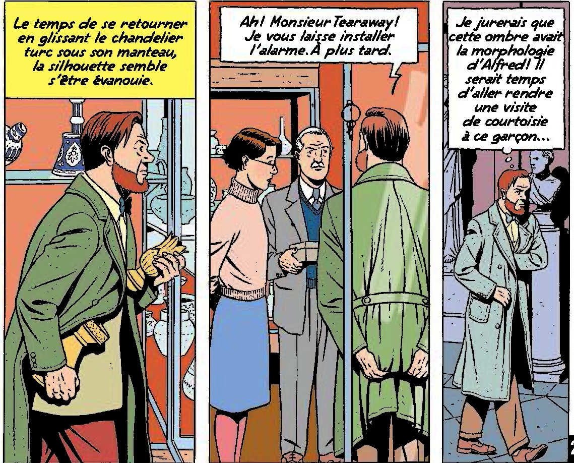Hi hi hi, elle est bien bonne. Mais blague à part, dans la dernière case ci-dessus Mortimer sort du bâtiment avec le bras gauche dans le manteau, je suppose qu'entre-temps il a déplacé le chandelier pour le mettre sous son bras droit, d'ailleurs le chandelier ne pourrait pas tenir tout seul dans le manteau, ce truc doit peser plus de 5 kilos si c'est ancien, c'est certainement du cuivre massif.