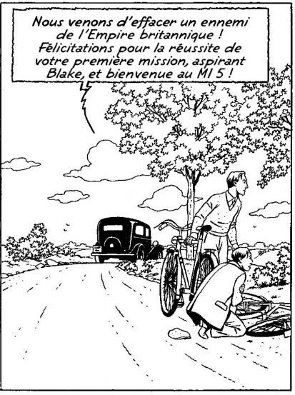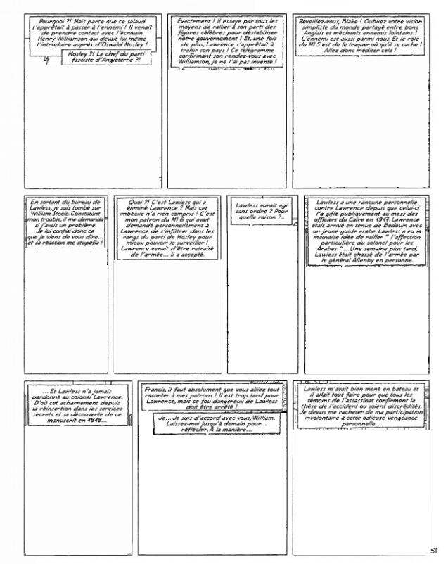 - toujours planche 45 : les articles de Thomas sur Lawrence datent de 1918 et Blake dit avoir eu alors huit ou neuf ans, ce qui le ferait naître vers 1910, un peu tard à mon sens, vu l'âge qu'il semble avoir dans Les Sarcophages du sixième continent qui se déroulent vers 1922 ; pour ma part je ferais plutôt naître Blake (et Mortimer également) vers 1904, ce qui lui donnerait 31 ans en 1935, peut-être un peu âgé pour débuter dans l'espionnage, raison pour laquelle Sente aurait été tenté de le rajeunir pour cette aventure ;
