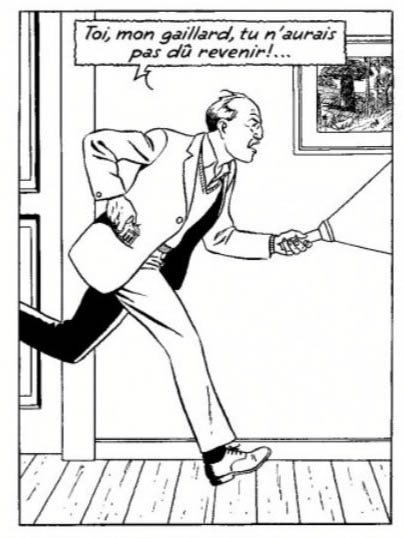 Il y a , quand même , dans la 2ème case , un petit truc qui m’a surpris à la première lecture . Il s’agit de la position trop bas de Blake à l’égard de l’escalier . Vu la vitesse du mouvement , suggérée par le dessin ( le contraste entre un Honeychuch ahuri et le départ soudain de Blake ) , il me semble inévitable que Blake touche la première marche avec son genou droit , avec tout ce qui s’ensuit . Mais peut-être il ne s’agit que d’une question de perception fausse de ma part . En tout cas , il aurait suffit de monter Blake quelques millimètres pour que le dessin soit correct .