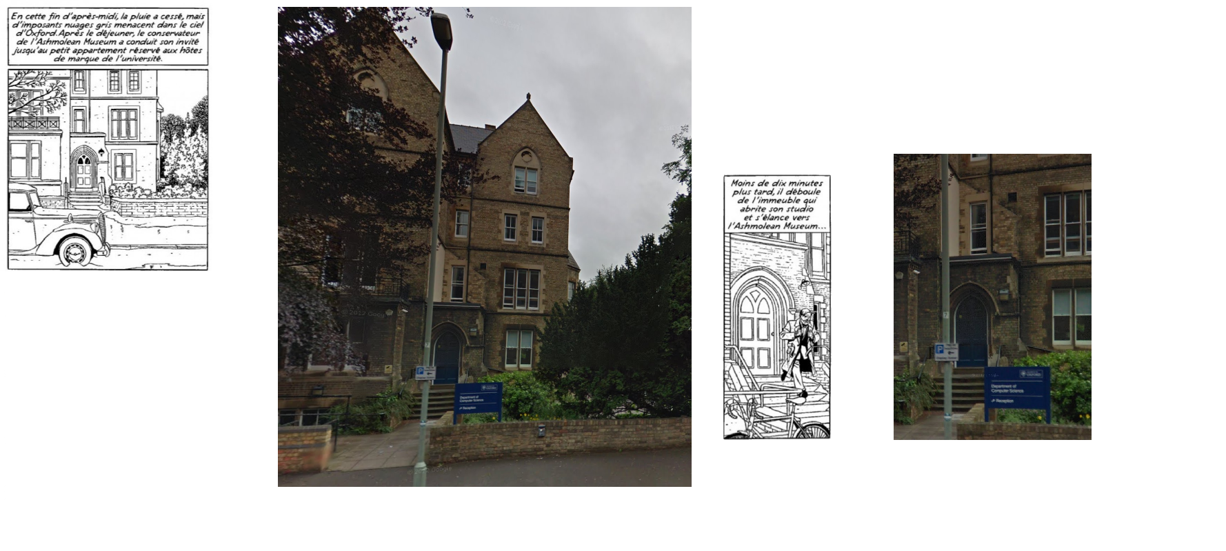 3ème case : c'est la façade extérieure de Keble College . La partie de la façade dessinée par Juillard se trouve dans la même rue , en face de 9 Keble Road .