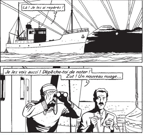 Sauf erreur, la troisième photo montre le coté est du rocher, et le photographe devait être pas loin de l'endroit où se trouve le chalutier dans la BD.