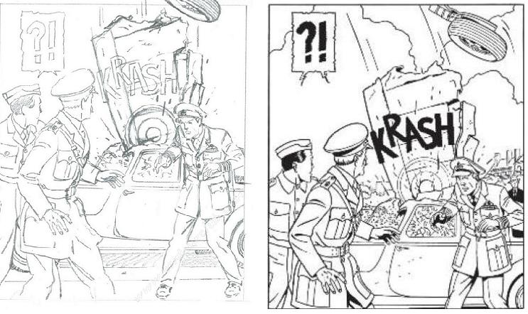 Ici, le trait est bien trop maigre, trop épuré, pour qu'il s'agisse du croquis initial fait par Juillard pour cette case. Parole de "dessineux" ;) ...