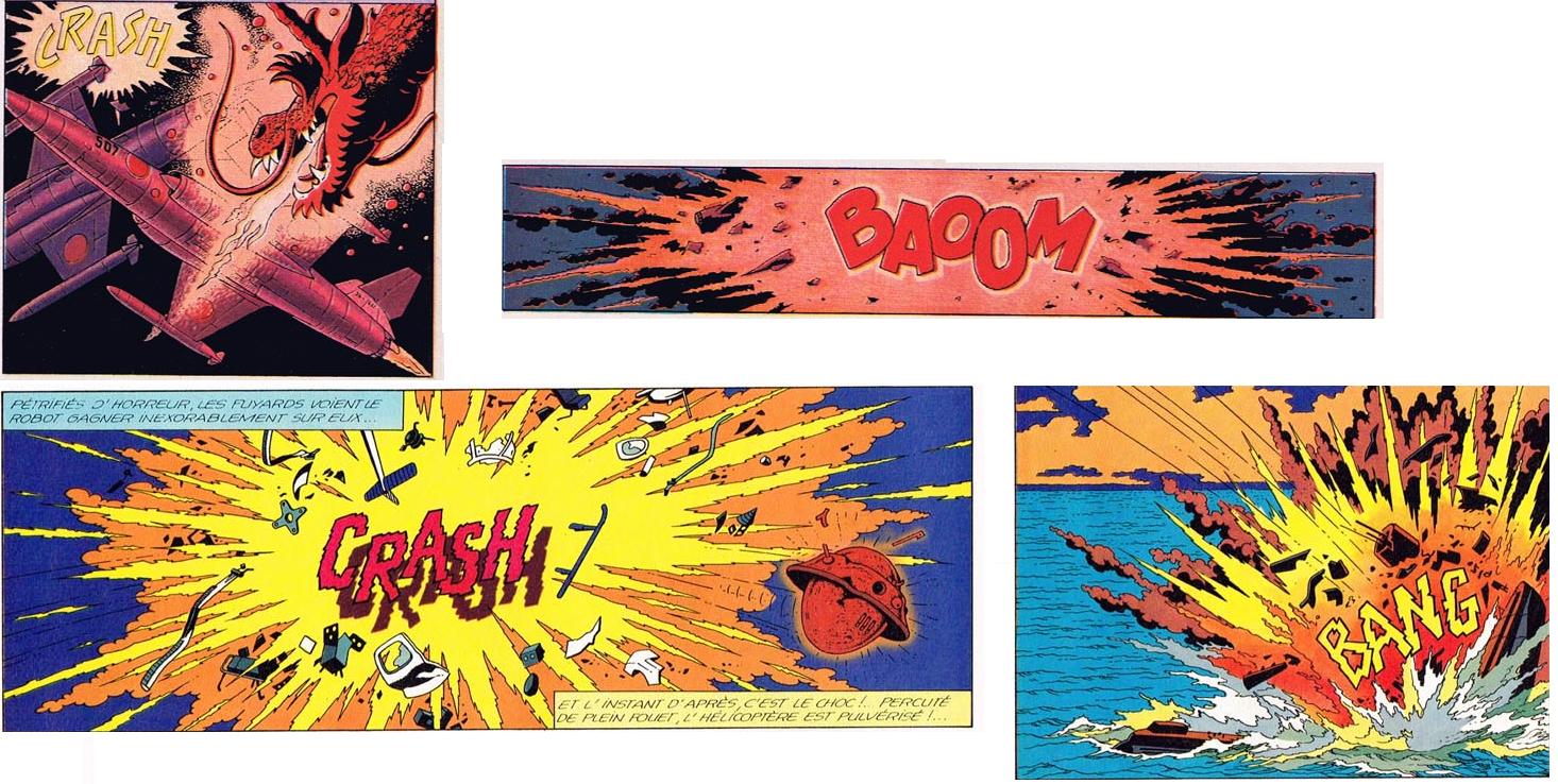 Jacobs écrit des Broooum (p.62 Piège diabolique), plouf (p.54 Piège diabolique), clac (p.54 Piège diabolique), crac (p 19 Piège diabolique). Je voudrais bien voir s'il y a autant de « c » et de « ou » dans les onomotapées des bédés contemporaines.
