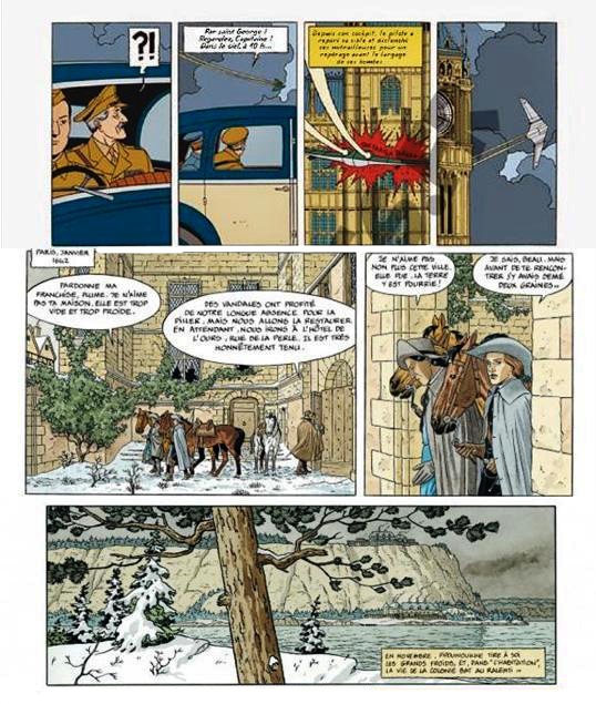 C'est clair que ce ne sera pas la meilleure planche, il y en avait des belles au début mais j'aime mieux attendre les couleurs pour me prononcer. J'ai lu les commentaires ici qui sont dans l'ensemble négatifs, j'avoue que j'ai survolé en vitesse tout ce qui concerne les modèles d'avions et autres subtilités militaires vu que pour moi c'est du chinois. Ce qui me dérange c'est que l'histoire commence avec 8 planches dans le ciel, c'est beaucoup trop long, même si on aime ça il y a un équilibre à respecter comme au cinéma : alternance des scènes d'extérieur et d'intérieur, de jour et de nuit, de ville et de campagne, etc. Et 22 planches sans Mortimer, ça commence aussi à devenir long, sans parler d'Olrik qui était déjà absent dans le Serment.