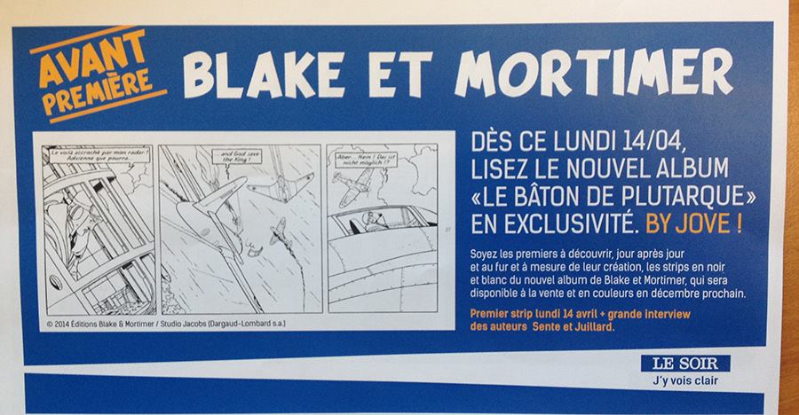 L'album sera pré-publié dans le magazine belge Le soir, à partir du lundi 14 avril (strips en noir et blanc)