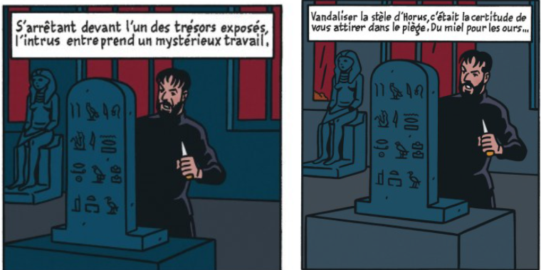 Mais pour beaucoup, un Blake et Mortimer se caractérise par plusieurs critères : Un scénario abouti, maîtrisé de bout en bout qui ne laisse pas la place au hasard et qui peut nous faire avaler des couleuvres (Comme la pierre de Maspero). Les dessins sont fouillés, précis, chargés, mais clairs, des textes à profusion, une maitrise du noir et blanc et des couleurs qui enivrent la rétine.