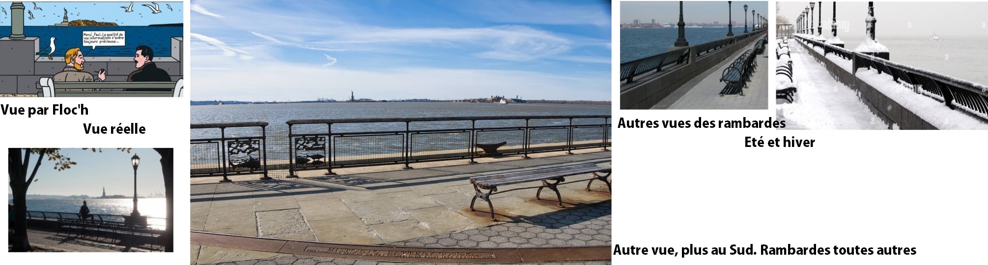 6-Planche 61, case 6, un peu plus de « rigueur » dans ses décors aurait évité au dessinateur de ne dessiner que des parapets en pierres massives, genre fortifications, au bord de l’Hudson River devant Battery Park, alors qu’il y a bien des rambardes en fer le long du fleuve, d’aussi loin que la rive a été protégée par une barrière. Qui plus est, l’actuel muret de soubassement d’une partie de l’Esplanade, celle dessiné par Floc’h, n’était (et n’est toujours pas) pas présent sur la totalité de la rive, et surtout pas à l’endroit (au droit de Staten Island-photo 1) où Mortimer et Paul Grunberg sont assis. Même la perspective serait fausse…