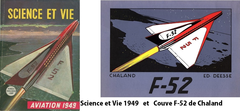 Cependant, concernant la surprenante dénomination (F) d’un engin comme l’aile volante de J. Northrop (que ceux qui n’auront pas fait le lien évident entre les déboires du vrai Jacques Northrop et ses fantastiques constructions, et Ronald Faibanks, ne se lamentent pas outre mesure, cela leur sera pardonné, car cela relève plus du domaine de la connaissance ou de l’intérêt pour la chose aéronautique), je me permettrai juste de rappeler que, dans la nomen-clature U.S.A.F., le « F » s’adresse spécifiquement aux « fighters-chasseurs », et que notre « F-54 », au vu de masse plus qu’imposante qui ne s’apparente en rien à un chasseur, même sur-vitaminé, aurait plutôt dû être appelé « B-54 » ; de « B » comme « bomber » ! Essaierait-on de nous « copier » le « F-52 » de Chaland, lui-même copié du « F-52 » apparaissant en couverture du Science et Vie Spécial Aviation 1949 ?? C’est très gentil pour Chaland, même si ce n’est pas le même type d’appareil, mais c’est un peu hors sujet dans le cas qui nous occupe.