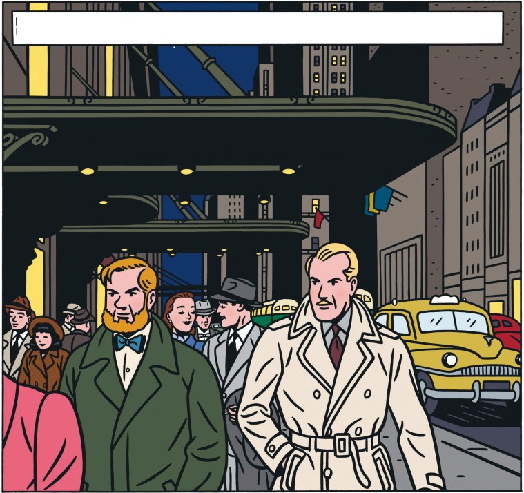 Floc'h réussit a donné l'impression qu'ils sont pris dans la cohue en dessinant, en premier plan devant Mortimer, une femme en rose dont on ne voit qu'une épaule.
