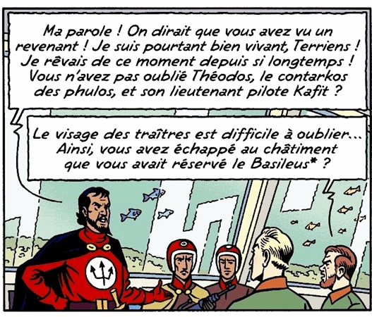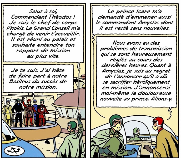 Kafit est pilote de « soucoupe volante » ce qui le place sous les ordres du Prince Icare, mais on se rend compte qu’il rend des comptes à Magon, dont il est le fidèle homme de main. Théodos planche 24