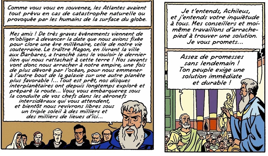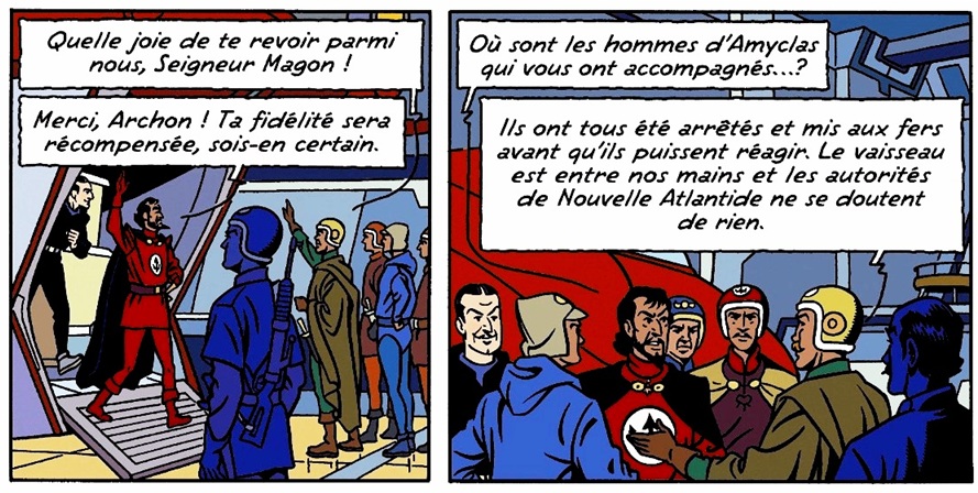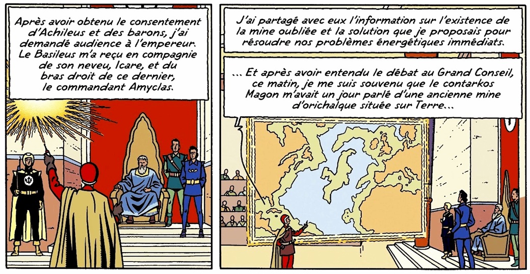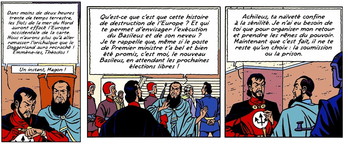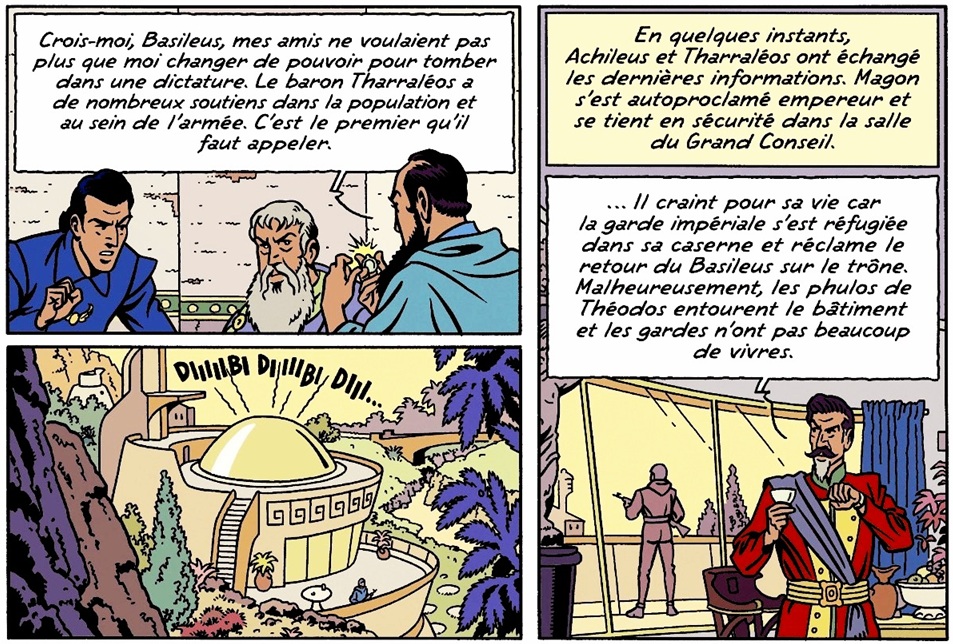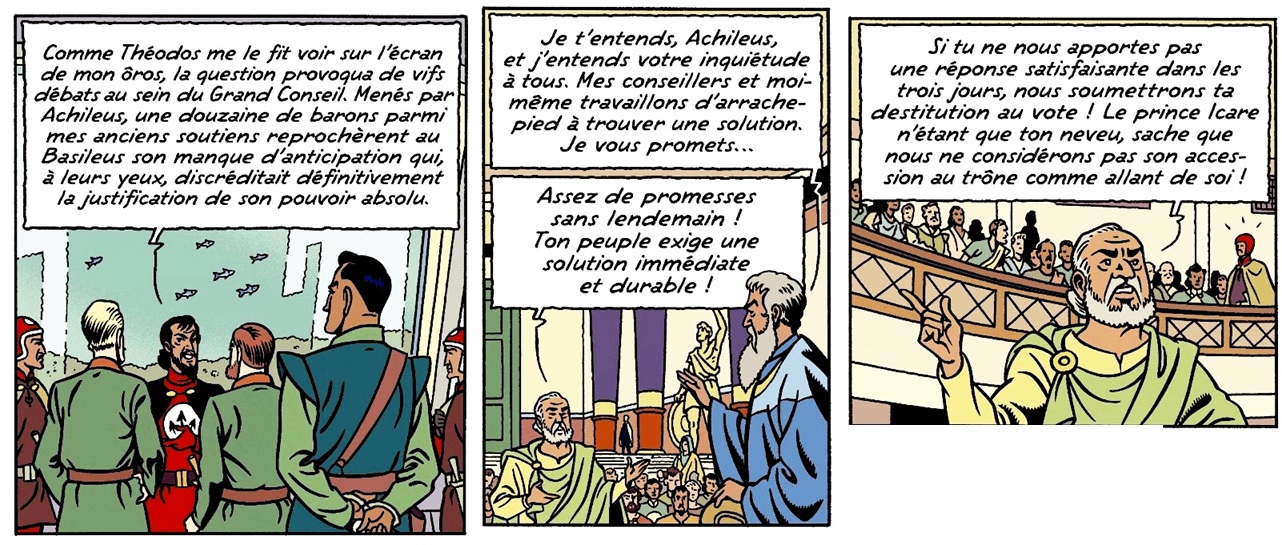 On ne connait son nom, Icare, qu’à la planche suivante. Dés sa première intervention on se rend compte de la rivalité avec Magon, qui s’adresse à lui en le désignant par son titre, Prince, probablement car c’est le neveu du Basileus.