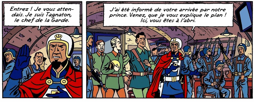 Pilote de char. Il doit être de confiance , puisque c’est lui qui conduit le char qui emmène Blake , Mortimer et le prince Icare en terre Barbare , au delà d’Omégara, dernier poste Atlante ! Haddad planche 45