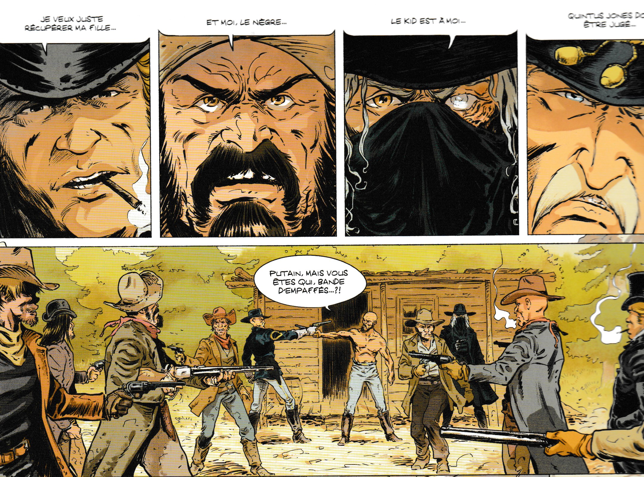 Planches 1 et 2 du tome 1, "Le massacre de Tanque Verde". « Oubliez les foutaises qu'on a pu vous raconter. L'Ouest n'a rien d'épique ou de romantique ; c'est un monde d'une violence incroyable »... Bref, oubliez Laura Ingalls, le ton est donné et ce n'est pas beau à voir.