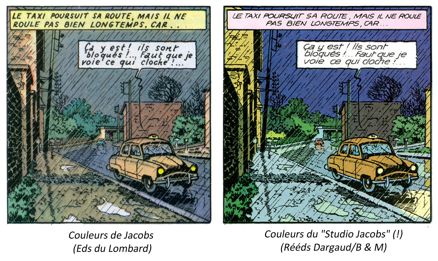 Merci, Will ! Et justement, pour rester dans l'analyse nuancée ^^ , voici 2 exemples parlants pour montrer que je ne voue pas un "culte" aveugle et sectaire aux anciennes éditions du Lombard... On y voit nettement que chaque version a ses avantages et ses inconvénients. 1er exemple : à gauche, l'ancienne édition Lombard, à droite la recolorisation dûe au "Studio Jacobs" (probablement Philippe Biermé/Luce Daniels)Will a écrit :Merci pour la superbe analyse "objective" et, surtout, nuancée, Thark ! ("Objective" entre guillemets parce que l'appréciation des couleurs a toujours un tout petit coté subjectif. C'est inévitable, à mon avis)