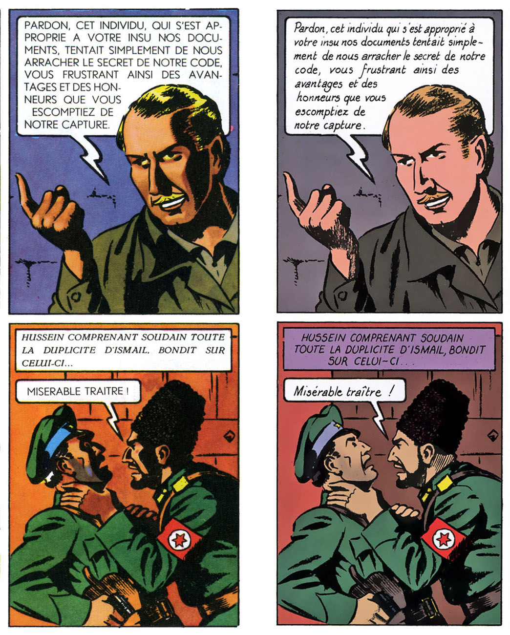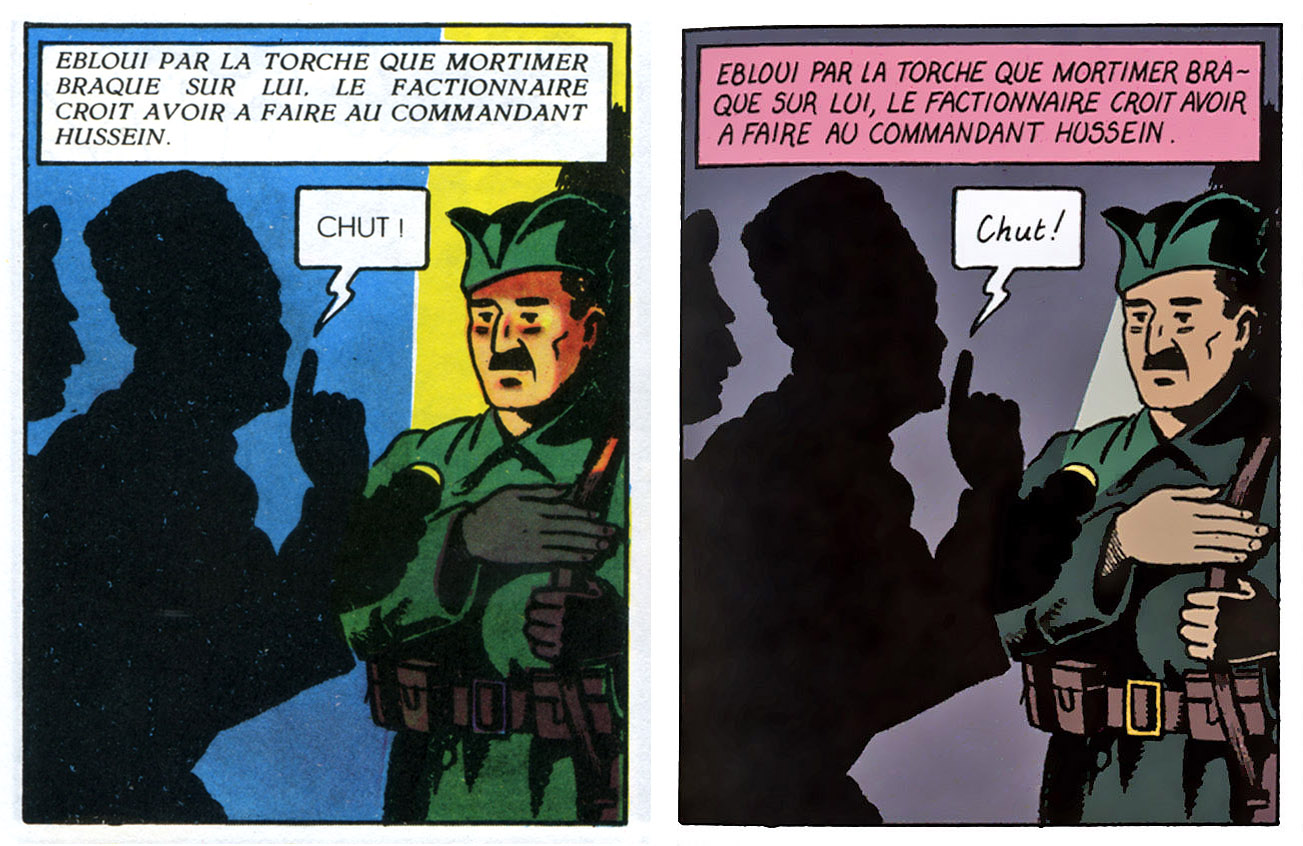 Là, c'est la version originelle de la main même d'EPJ qu'on pourrait qualifier de 'criarde'... Mais au moins, le visage de la sentinelle est réellement et visiblement ébloui par la torche ! Les ombres sur le visage accentuent la violence de l'éclairage. Or, une fois recolorisée, le faisceau lumineux est tout pâle, tout fade, et le visage du factionnaire semble avoir tout bonnement un éclairage standard, sa peau étant exactement de la même teinte que tous les autres visages de la même page... Qui pourrait être de nuit comme de jour, indistinctement... Par contre, la réédition présente de beaux à-plats noirs, bien propres ! Donc, du pour et du contre...