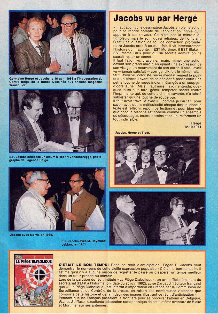 "Lorsque j'ai rencontré EPJ en 1979... /... il trouvait mauvaise l'impression de ses albums et il avait raison : les films avaient beaucoup vieilli. En voyant ses planches originales, j'ai eu l'idée de lui proposer d'éditer ses albums en très grand format. Les éds du Lombard se sont opposées à ce projet. Mais comme Jacobs a décidé de ne pas reconduire ses accords avec Le Lombard, nous avons pu créer ensemble, avec Christian Vanderaeghe, les éds Blake et Mortimer"...
