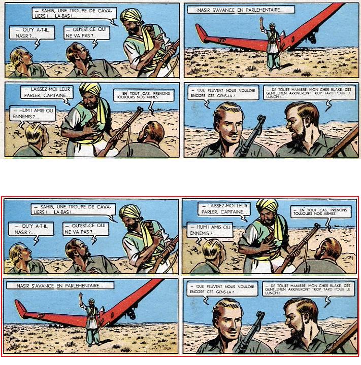 2/ensuite j'ai remarqué, quand il y a 4 cases en damier, que Jacobs nous demande de lire la colonne de gauche de haut en bas, puis idem avec la colonne de droite ; ex : p60 pour moi, quand nos 2 héros et Nasir se sont crashés avec l'Aile Rouge dans le désert et que Nasir dit "Sahib ! Une troupe de cavaliers !". J'ai plusieurs exemples aussi... jusqu'à la p147 où là (peut-être parce que Jacobs s'est rendu compte que ce n'était pas logique par rapport au sens de lecture ?), Jacobs nous fait lire "normalement" une ligne de G à D puis l'autre ligne (quand Nasir remarque que la grille de la cheminée d'aération est ouverte)