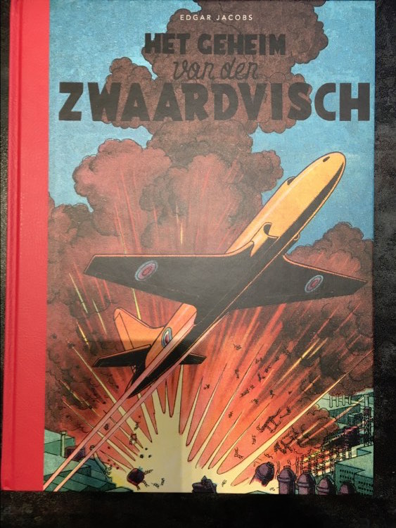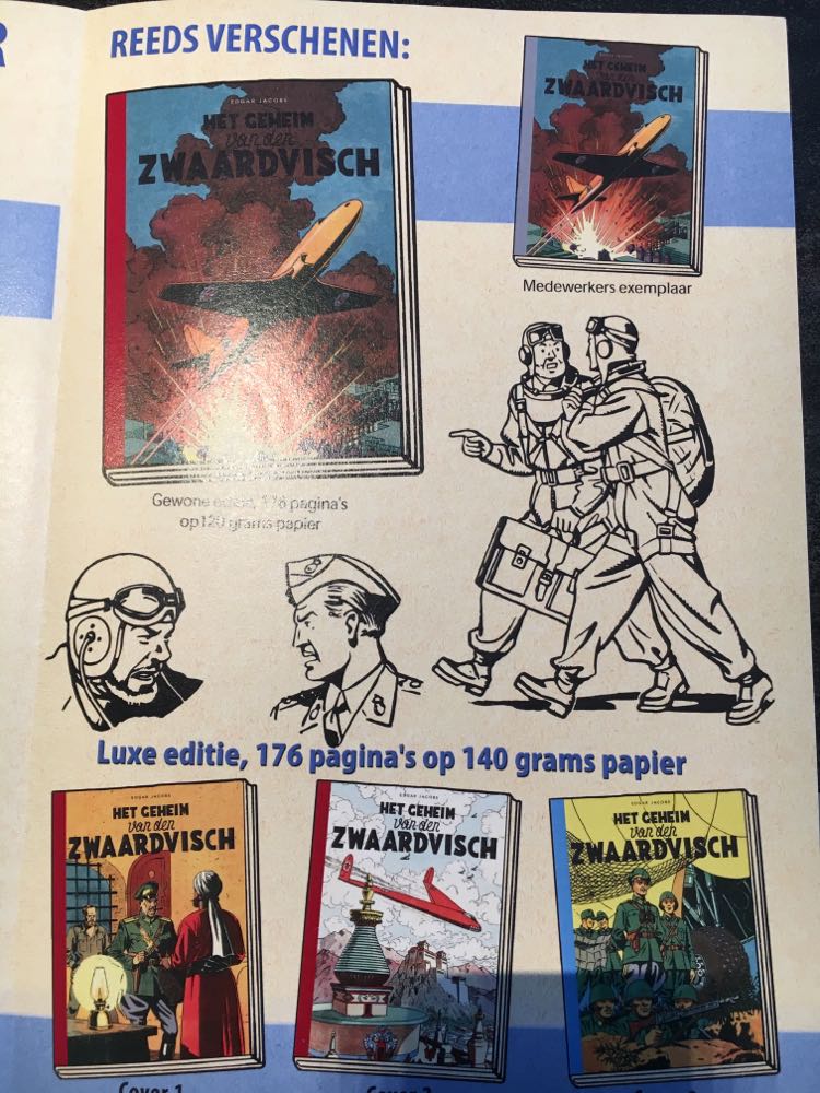 "En 2015, 'Het Geheim van den Zwaardvisch'a été publié, dans l'ancienne orthographe néerlandaise et avec une couverture d'album très différente, à savoir le décollage du Golden Rocket telle que Jacobs l'avait dessinée pour le numéro 6 du magazine hebdomadaire Kuifje (publié le 31 octobre 1946).
