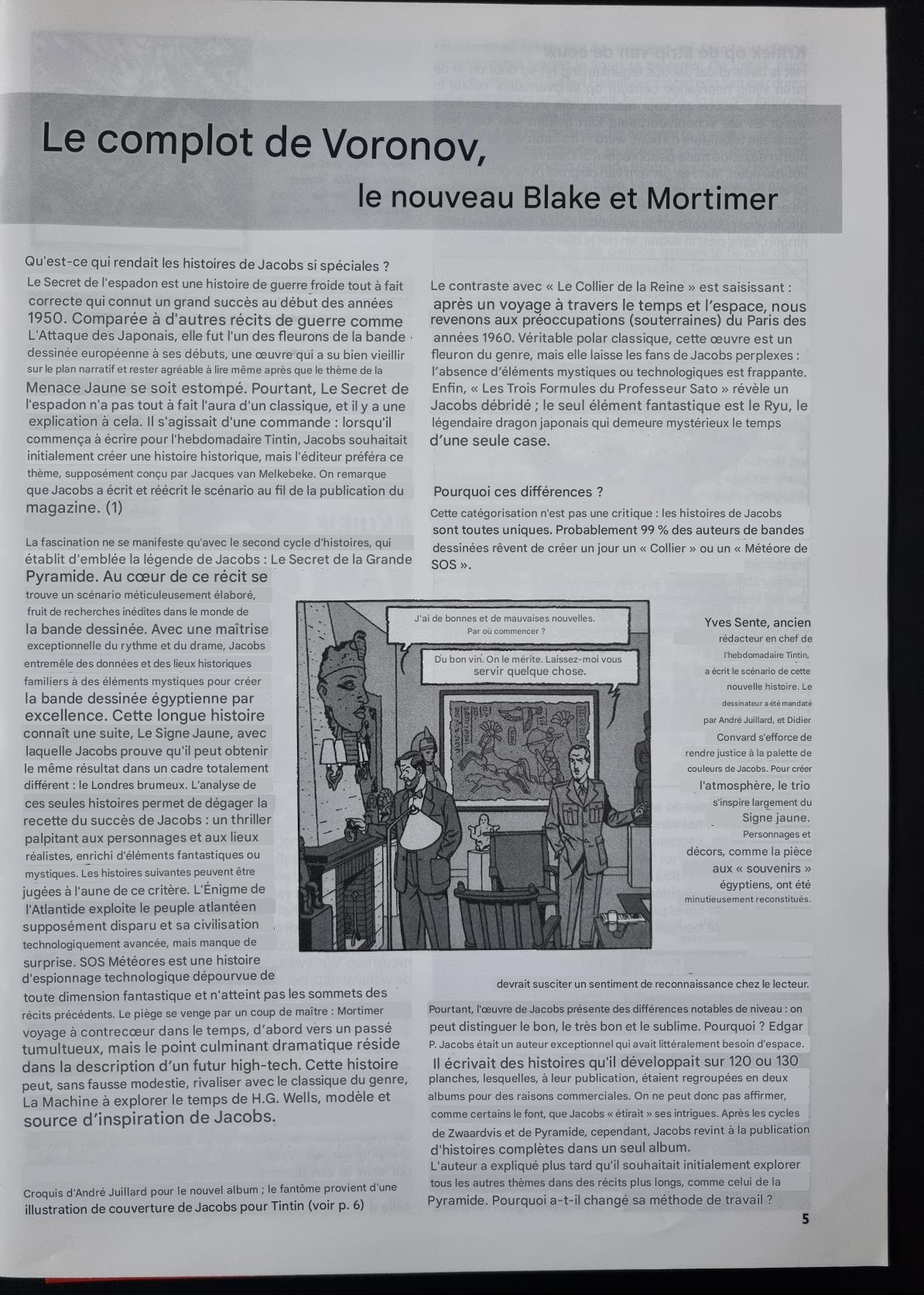 Jacobs. À l'occasion du concours de 1984, Le Monde d'Edgar P. est paru dans la collection Nos Auteurs, et Tintin a publié un numéro spécial « E.P. Jacobs » le 4 décembre 1984. Dix auteurs y rendent hommage à Jacobs. Le Théâtre mystérieux, une courte histoire en 14 cases de Rivière et Carin, est intéressante car Edgar Jacobs lui-même y apparaît comme acteur. Avec son ami Jacques (Van Melkebeke, dont Mortimer est inspiré), il boit un verre au Bon vieux temps. Jacques Laudy, le modèle de Blake, y est également présent. Au regard de l'actualité, la contribution d'André Juillard se distingue : Blake et Mortimer, désormais à la retraite, retournent en Égypte. (6) Avec Convard, Juillard développera cette case en un livre illustré en 1998.