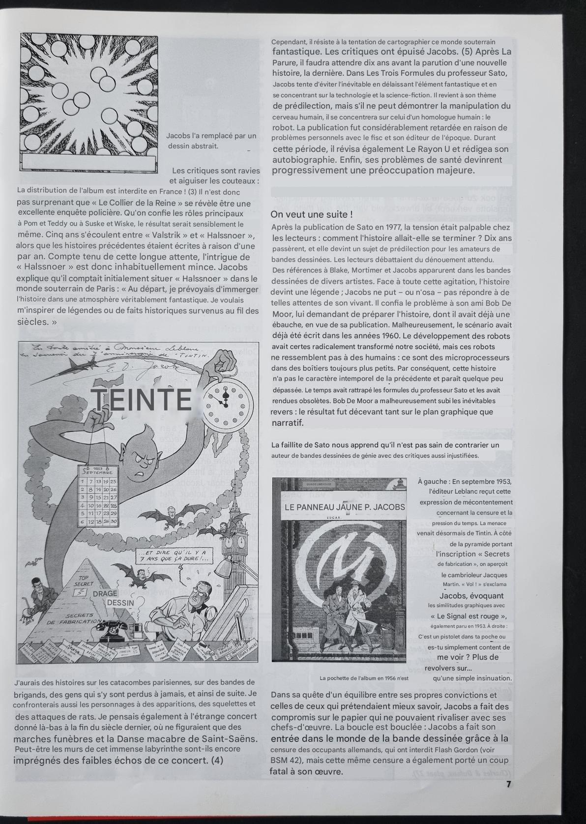 Dans sa quête d'un équilibre entre ses propres convictions et celles de ceux qui prétendaient mieux savoir, Jacobs a fait des compromis sur le papier qui ne pouvaient rivaliser avec ses chefs-d'œuvre. La boucle est bouclée : Jacobs a fait son entrée dans le monde de la bande dessinée grâce à la censure des occupants allemands, qui ont interdit Flash Gordon (voir BSM 42), mais cette même censure a également porté un coup fatal à son œuvre.