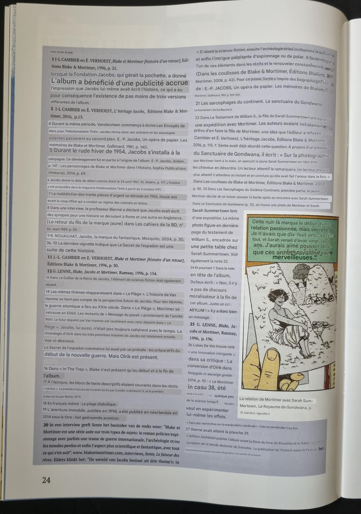 22 Dans Le Testament de William S., la fille de Sarah Summertown entreprend une expédition avec Mortimer. Les auteurs avaient initialement prévu d'en faire la fille de Mortimer, une idée que l'éditeur a refusée. J.-L. Cambier et É. Verhoest, L'héritage Jacobs, Éditions Blake & Mortimer, 2016, p. 115. Y. Sente avait déjà abordé cette question. À propos d'un passage du Sanctuaire de Gondwana, il écrit : « Sur la photographie que Mortimer tient à la main, on aperçoit la jeune Sarah Summertown en robe d'été, les cheveux en désordre. Un lecteur attentif le remarquera. Un lecteur encore plus attentif s'attardera un instant et en conclura qu'elle avait fait l'amour dans le foin. » Dans Les coulisses de Blake et Mortimer, Éditions Blake & Mortimer, 2008, p. 50. 23 Dans Les Sarcophages du Sixième Continent, première partie, le jeune Mortimer décide de se laisser pousser la barbe après sa rencontre avec Sarah Summertown. Dans Le Sanctuaire de Gondwana (p. 12), on trouve une photo de Mortimer et Sarah.