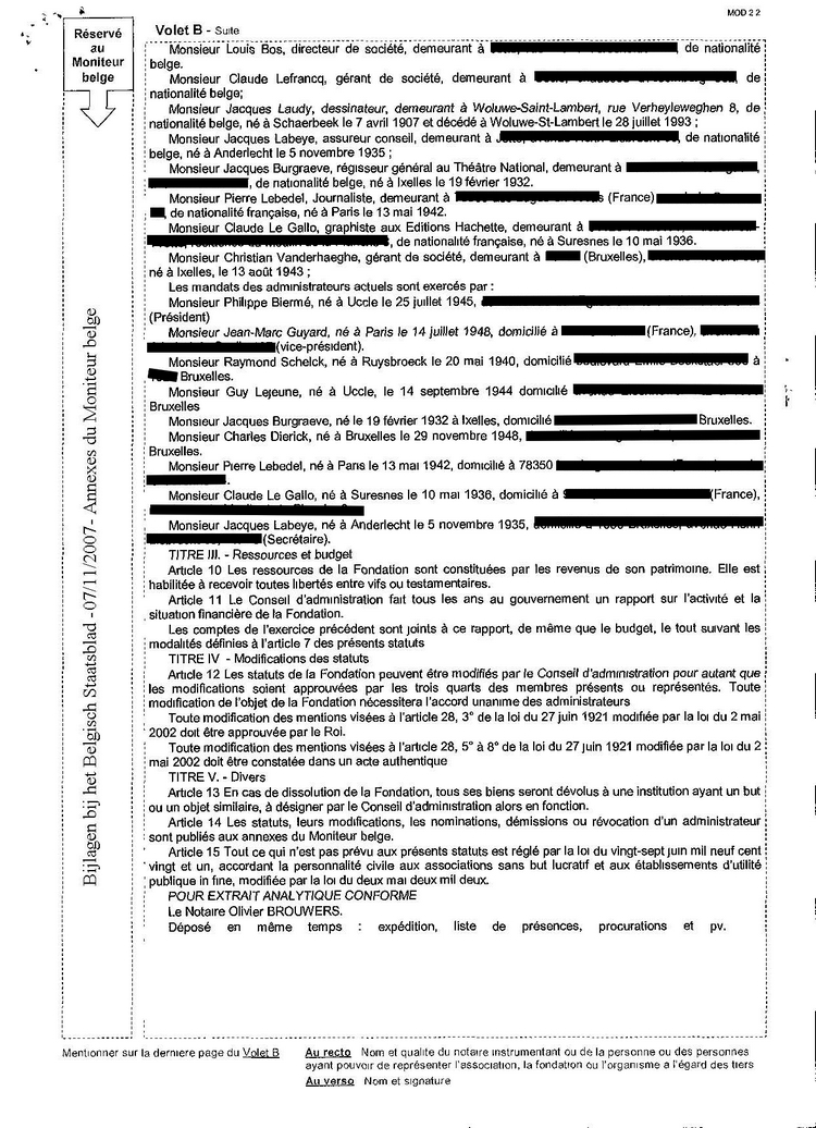 Voici les 3 pages.extrait Acte V - Article 13du compte rendu de la réunion qui modifie le statut de la fondation Edgar P. JACOBS du 26/10/2007 a écrit :
