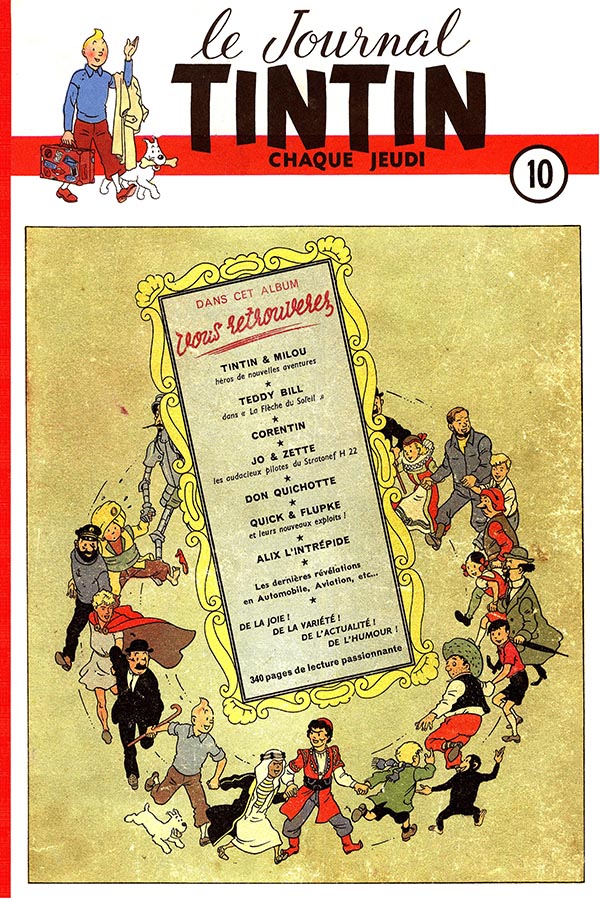 Mise en bouche immédiate par le biais d’un cahier quadri de 16 pages qui reprend en diaporama chronologique les 360 Personnages/Séries à suivre publiés dans le Journal Tintin & Hello Bédé.
