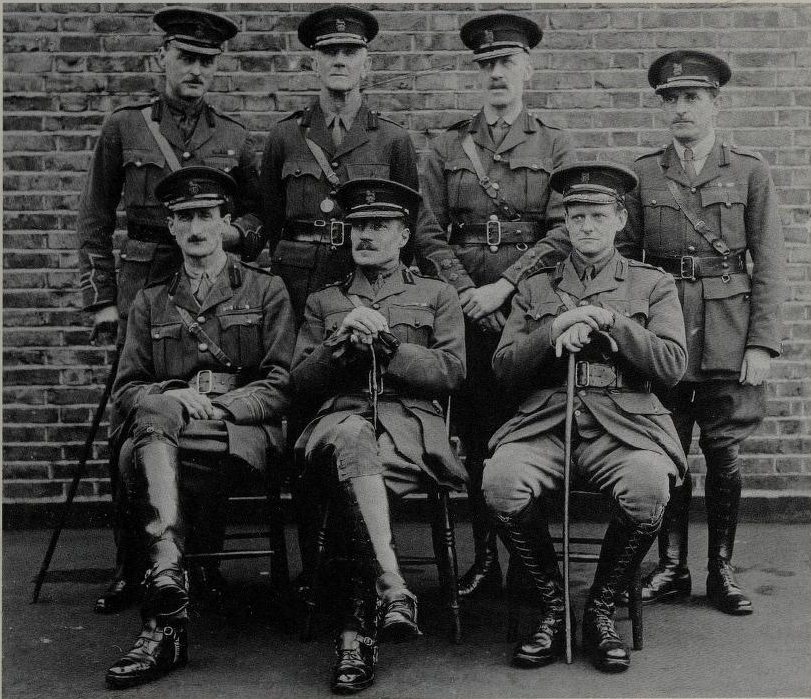Devant, de gauche à droite : Lieutenant Colonel Eric Holt-Wilson (adjoint du directeur); colonel à titre temporaire Vernon Kell (directeur du MI5); Lieutenant Colonel Maldwyn Makgill Haldane (chef du registre et de l'adminitration).