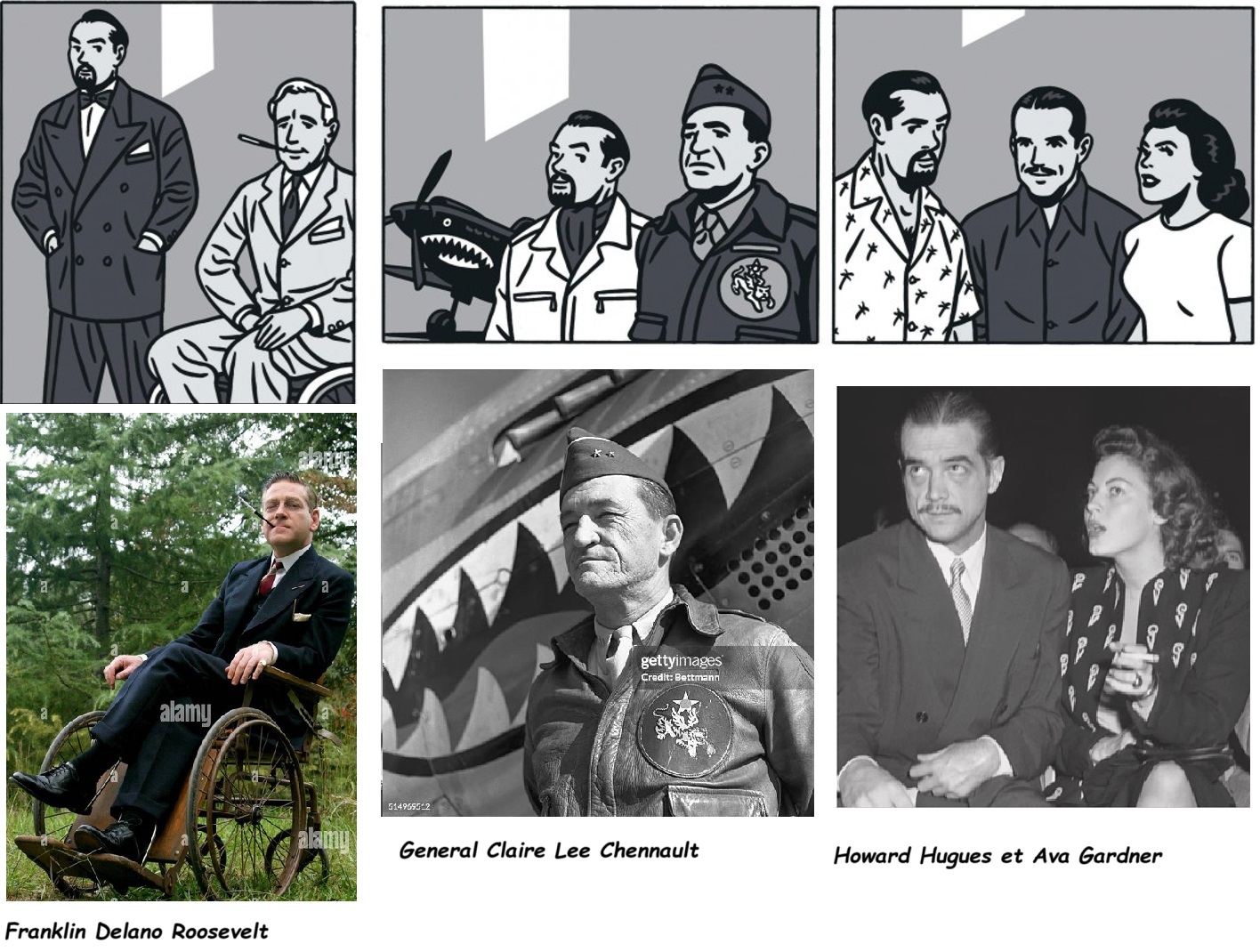 Franklin Delano Roosevelt, Le général Claire Lee Chennault (Fondateur de l'escadrille des Tigres volants),Howard Hugues et Ava Gardner sont cités de manière indirecte par Blake quand il regarde les photos.