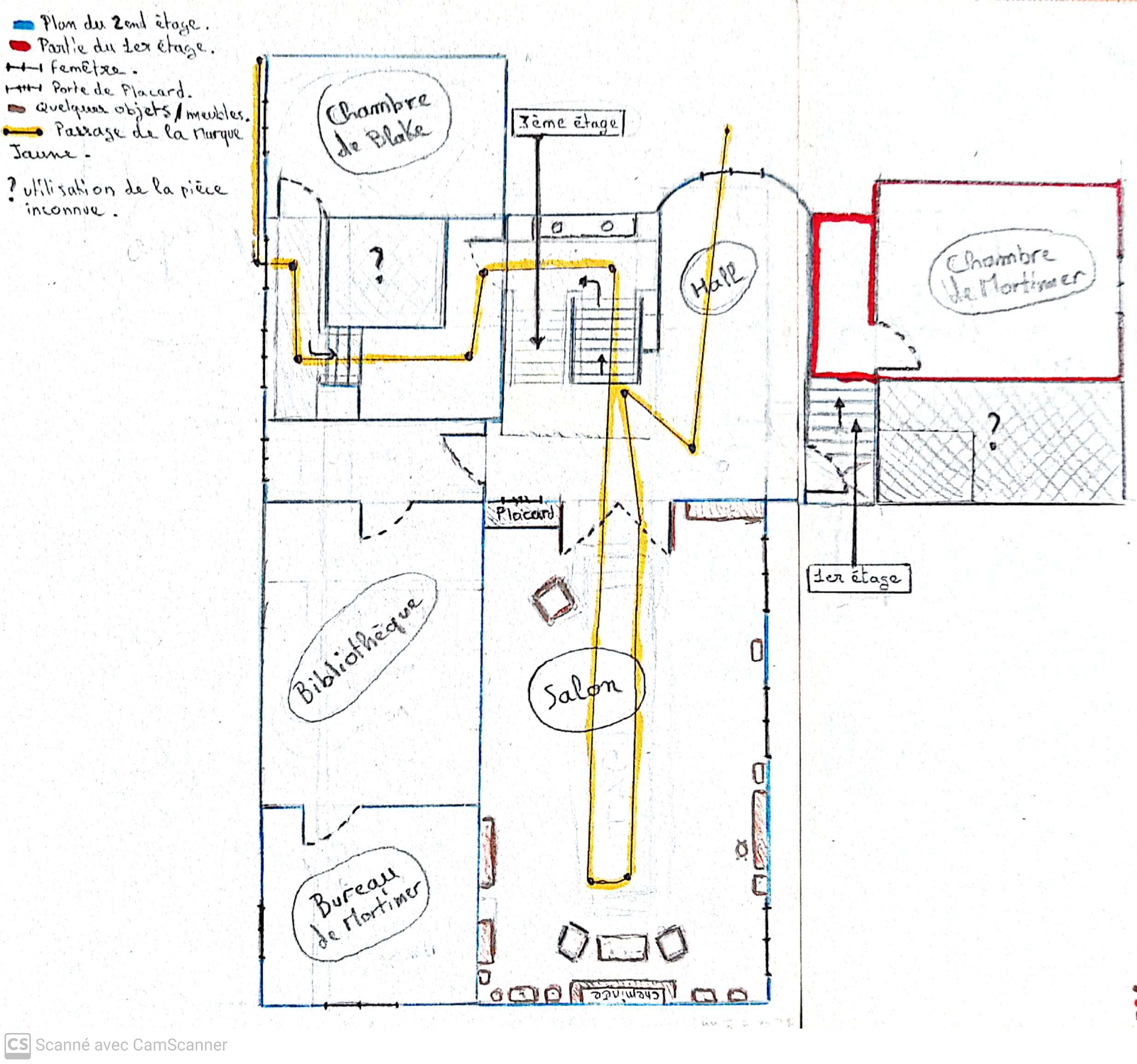 Je pense avoir également résolu la question que l'on se pose : " E. P. Jacob a dit dans 'La Marque Jaune" au moment où Guena Pig entre dans l'appartement, qu'il passe par une fenêtre du 2end étage, puis qu'il descend un escalier ( de 8 marches exactement ) et, après s'être rendu au salon et avoir été surpris par Mortimer, qu'on le voit sauter d'une fenêtre étant de nouveau au second ( au dessus du bow widow )." Effectivement, vu comme ça, c'est très embrouillé mais je crois que le second étage comporte plusieurs petits niveaux.