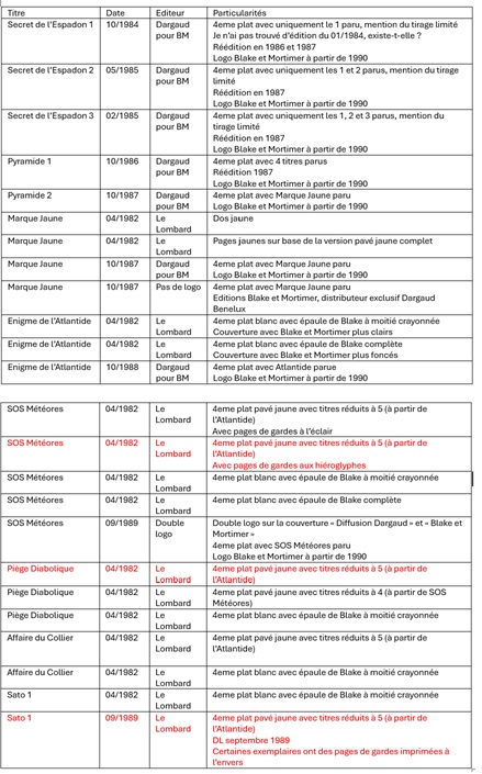 Pour Sato 1, la version 5 titres est la seule à avoir à l'intérieur un DL qui diffère de 1982 marquée comme dépôt légal septembre 1989 soit quelques mois seulement avant la première version de Blake et Mortimer qui est elle datée de 01/1990 !