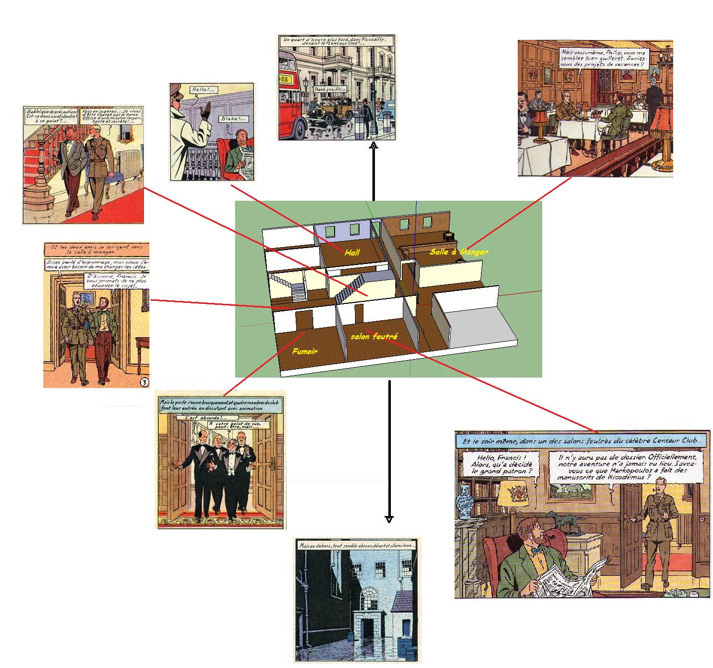 La première difficulté est que Jacobs n'a pas dû laisser de plan, et on a vue qu quand on essaie de reconstituer le 99 bis, on ne comprend pas où est située la fenêtre du bow-window par rapport au hall...archibald a écrit :c'eut été bien que dans le 'cahier des charges' des repreneurs , il y eut un plan de ces deux lieux mythiques que sont le 99 bis et le Centaur Club...