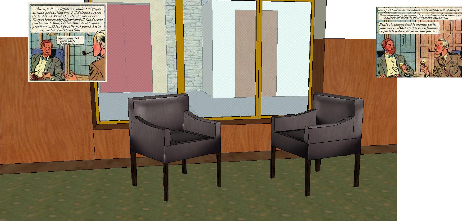 dans laquelle j'ai placée la porte à double battant , les fauteuils où sont assis B&M les fenêtres et la cour intérieure ...