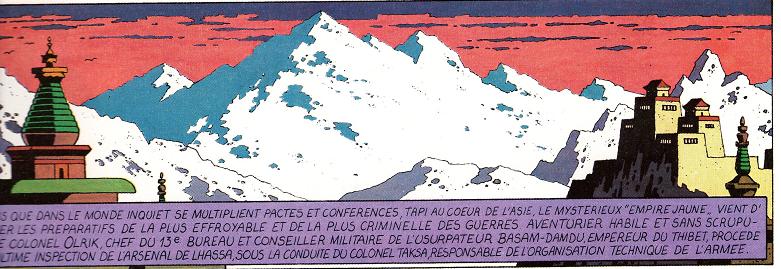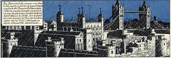 1 la lumière : La plupart des aventures commence par une scène d'extérieur avec une luminosité assez faible. Jacobs semble avoir un gout prononcé pour la nuit ou les ciels couverts, plus riches en couleurs qu’un ciel d’azur sans nuage. Cela apporte également une ambiance de mystère et un climat plus pesant qui se marient bien avec les aventures de nos héros.