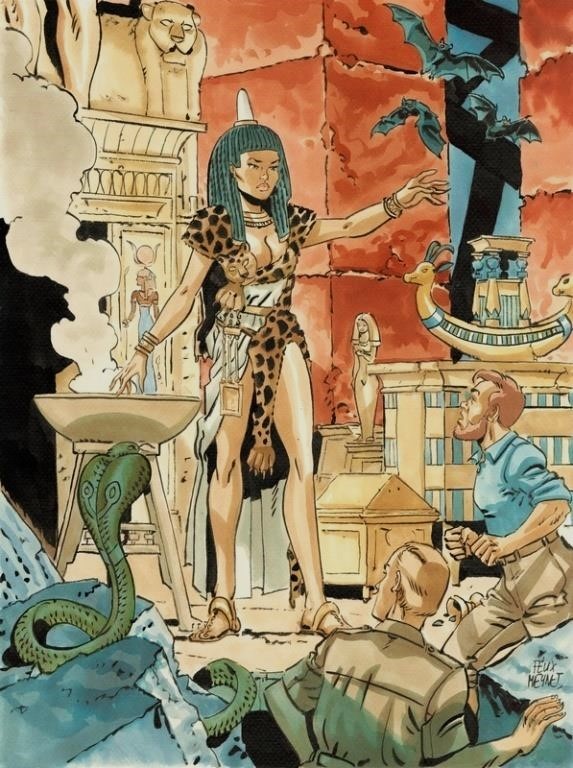 Description : "Meynet. Encre de Chine et aquarelle pour cette illustration originale inédite réalisée en hommage à Jacobs et Blake et Mortimer. Magnifique évocation d’une scène mythique extraite du Mystère de la Grande pyramide. Composition sur carton. Signée. 30x40cm".