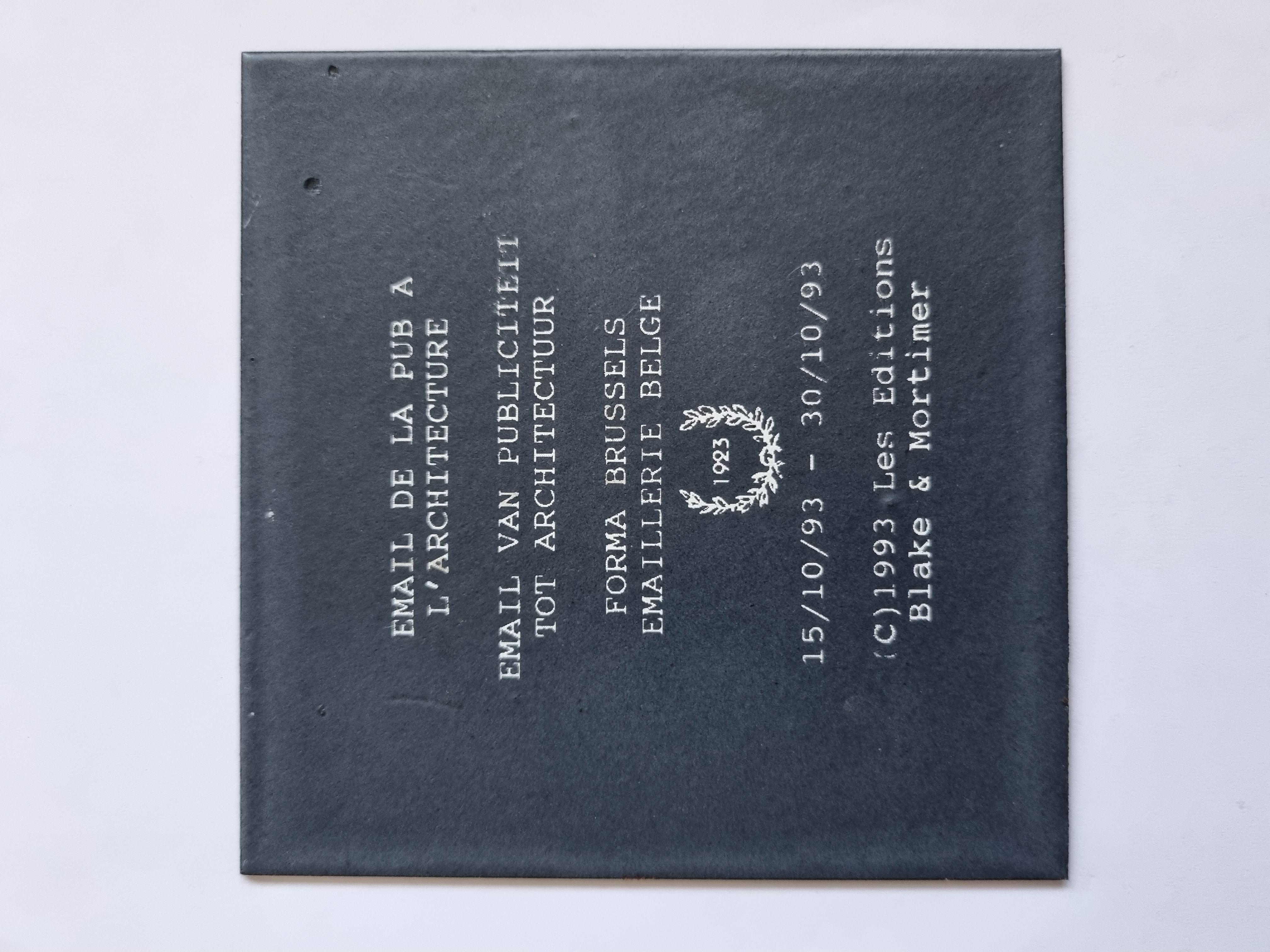 Voici une petite plaque émaillée (10x10 cm) hors commerce offerte du 15 octobre 1993 au 30 octobre 1993 aux clients des Émailleries Belges.