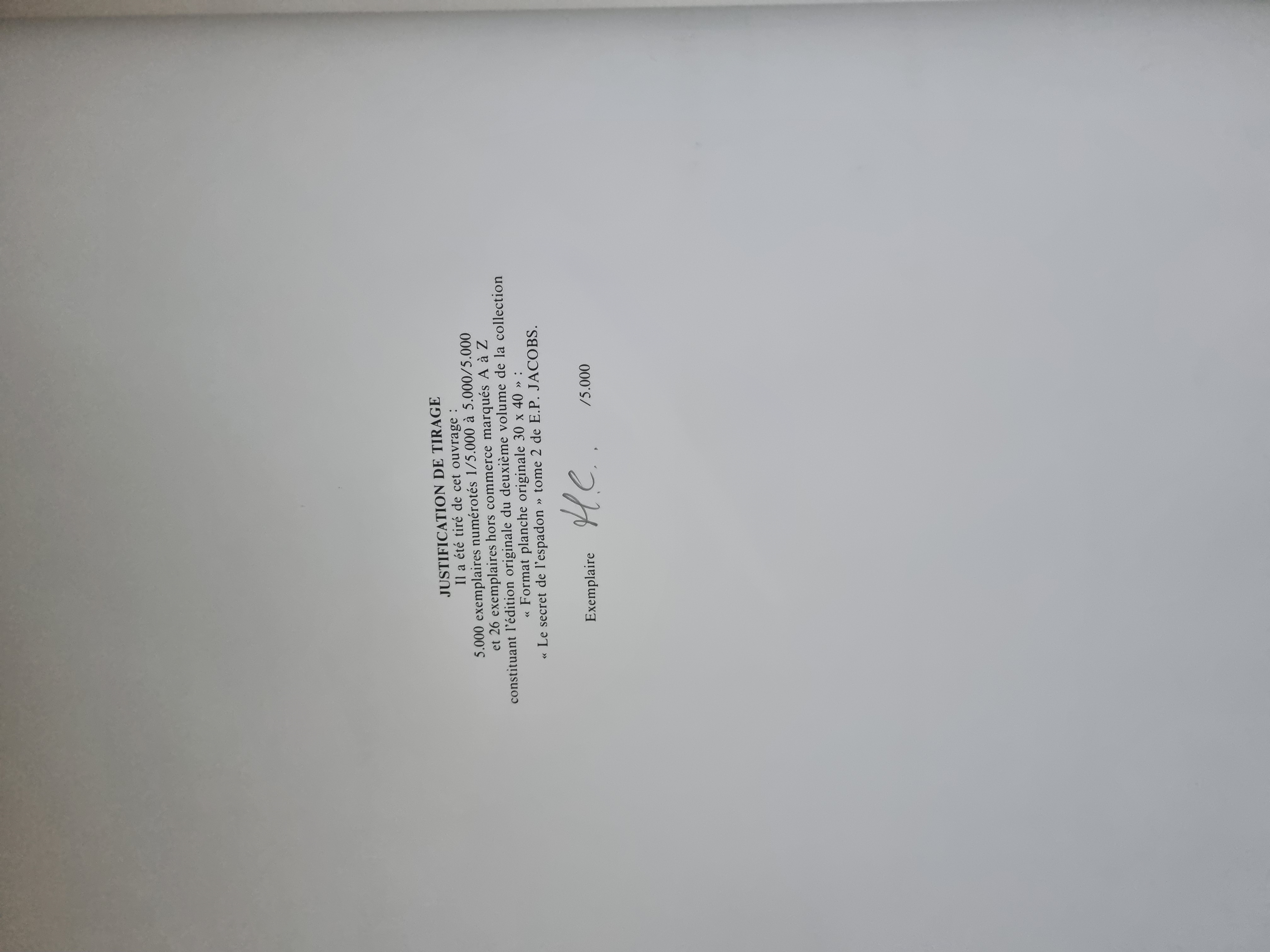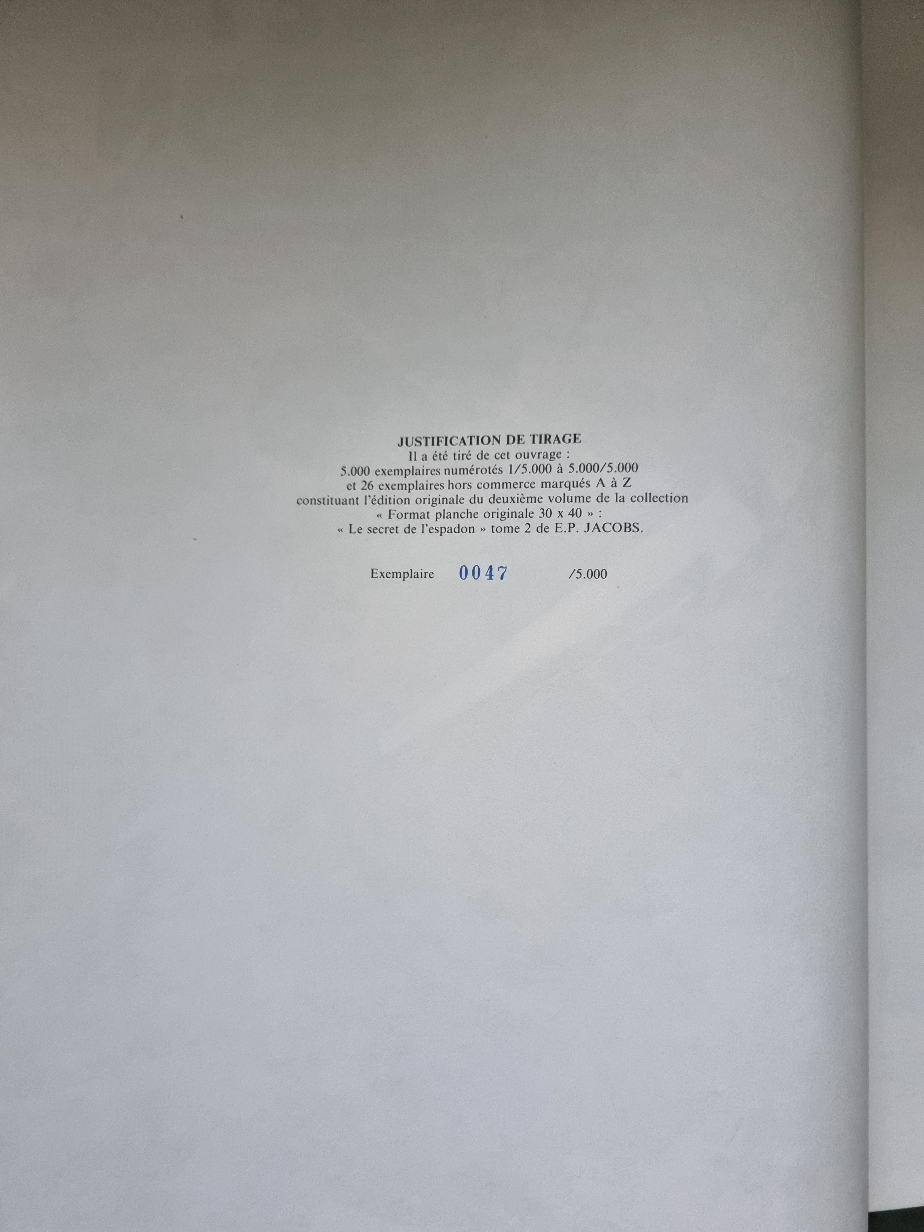 5000 exemplaires numérotés 1/5000 à 5000/5000 et 26 exemplaires hors-commerce marqués de A à Z constituant l'édition originale et unique du premier volume de la collection « format planche originale 30 x 40 » : » le secret de l'espadon » tome 2 de E.P.JACOBS.