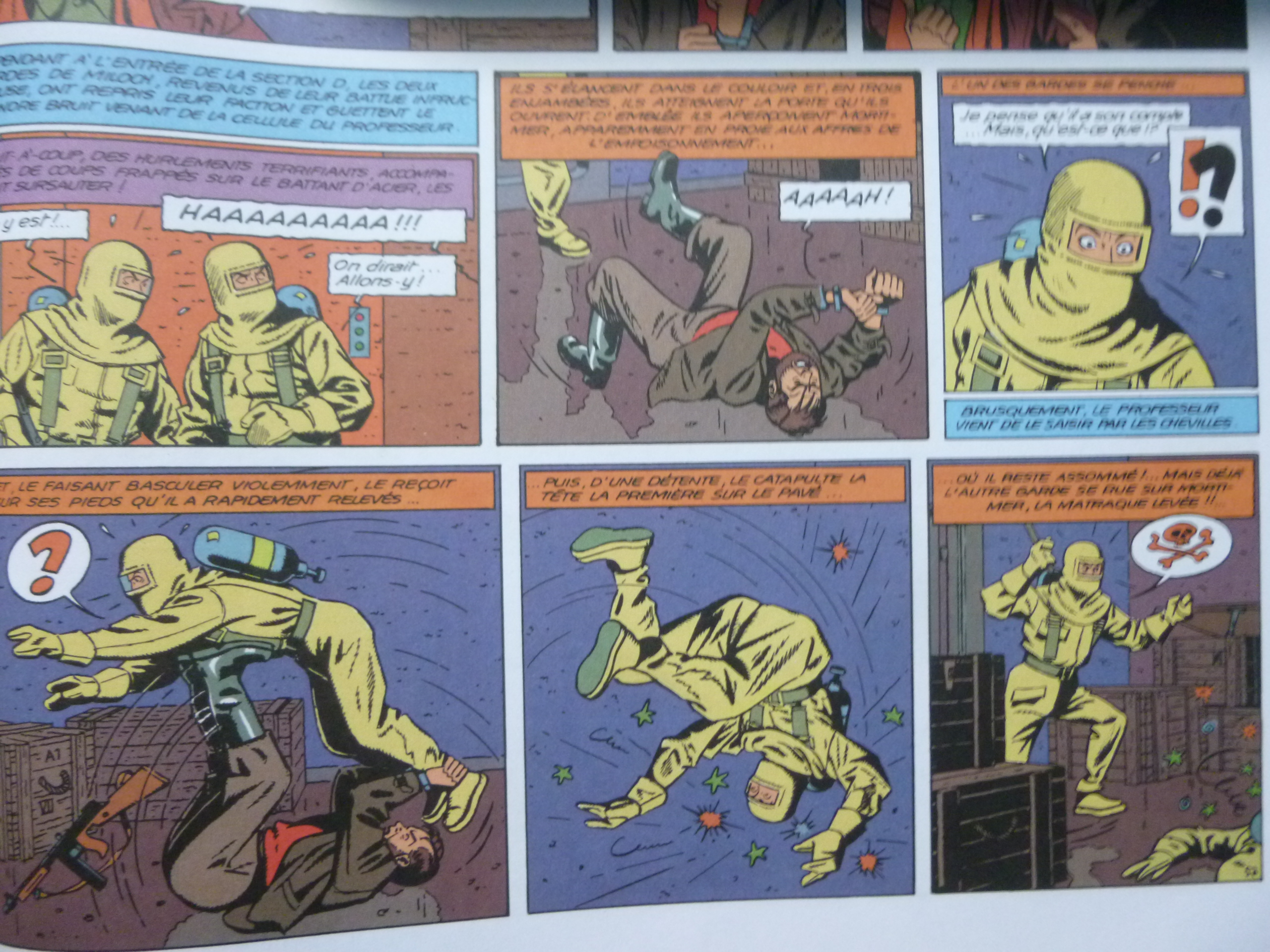 - Ensuite, après la bascule que Mortimer a faite au garde, celui-ci tombe a terre, assommé. On y voit à la dernière case de la planche... Sauf que, par rapport à la porte, Mortimer était quand même assez proche de l'encadrure ! Comment se fait-il qu'il ne soit plus au bon endroit ? Les récitatifs ne le disent pas !