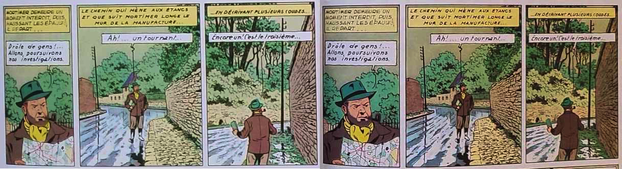 (vous remarquez qu'en dehors des couleurs, de nombreux détails du trait apparaissent dans l'édition de 1982 alors qu'ils disparaissent dans le fac-similé, comme si la mise au point n'avait pas été réalisée)
