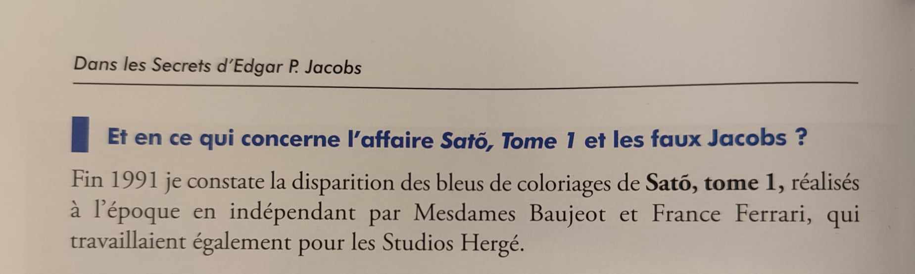 Cela étant attesté pour le Piège Diabolique, et surtout, le Rayon "U" version 70's, il est tout à fait improbable que Jacobs ait réalisé les bleus de coloriage de Sato I, a fortiori à une période particulièrement difficile de sa vie.