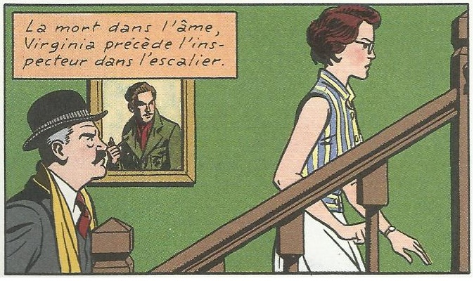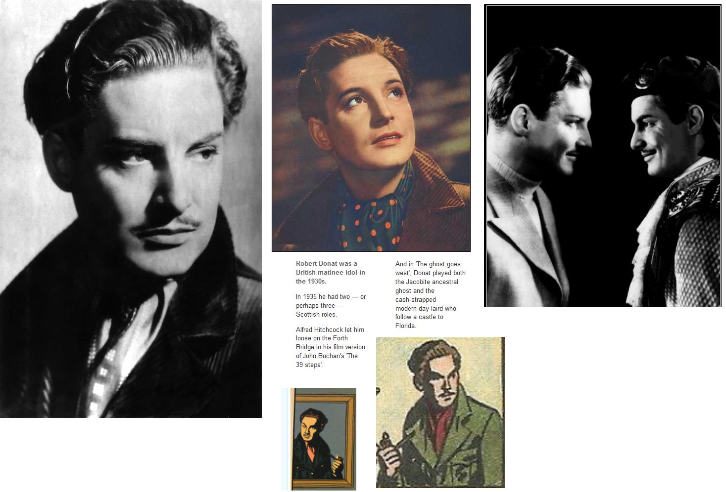 Le cinéphile reconnaitra Robert Donat, acteur britannique qui incarne le personnage principal des 39 Marches. La référence au modèle hitchcockien semble être placée là avec nonchalance et malice, renvoyant à la tradition référentielle de l’arrière-plan en bande dessinée, riche en clins d’œil de toutes sortes. Sauf qu’ici la photographie de l’acteur a été réalisée pour le film de René Clair The Ghost Goes West (Fantôme à vendre, 1937), succulente comédie dans laquelle Robert Donat joue un double rôle.