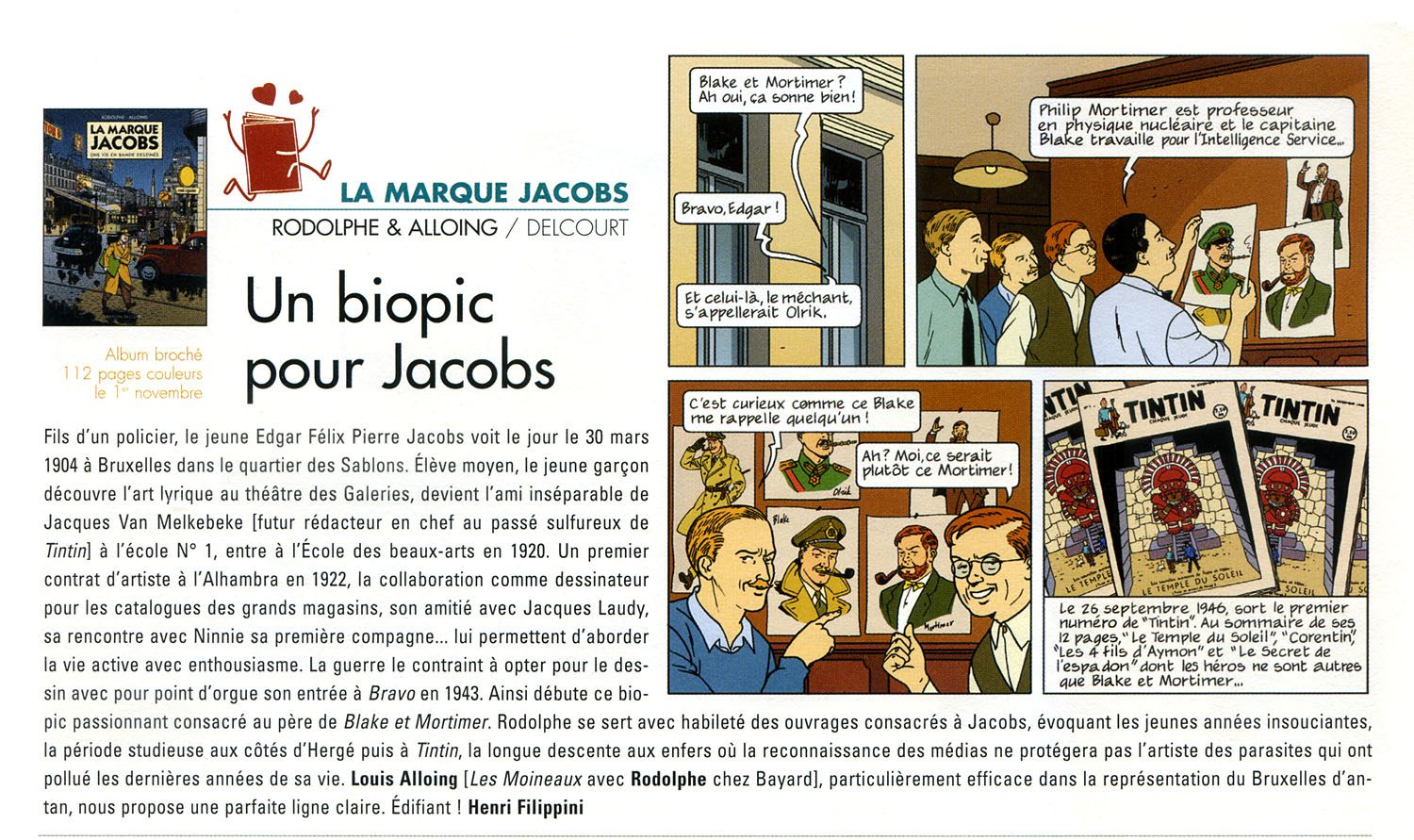 Je ne sais pas si on a parlé mais la RTBF (télé belche) a parlé d'une biographie de Jacobs par Rodophe et Alloing qui ne paraîtra peut-être pas pour cause de plagiat. Décision de justice demain apparemment.