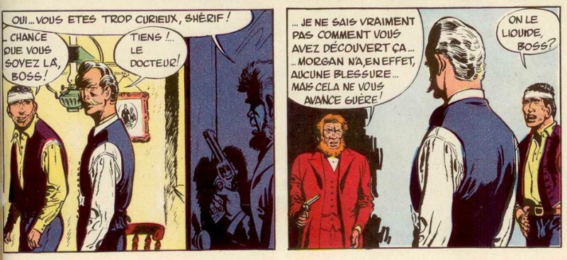 On y retrouve bien le shériff à moustaches blondes, et le brigand à barbe rousse qui tient le revolver.