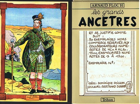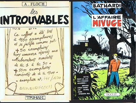 Editions Trihan sans date. Coffret tiré à 1550 exemplaires n° & signés par l'auteur avec 8 cartes postales n° où Floc'h pastiche & détourne des couvertures de Jijé ( Bontein & Mirage - Bathardi ), Hubinon ( Duck Dany - Les vrais histoires de l'oncle Gol ), E.P.Jacobs ( Destination Transylvanie ), Peyo ( Grohan & Ptilouit ), Macherot ( Chlostrophylle ) & Franquin ( Spouri & Fatansion ). Etat de neuf. Rare édition originale.